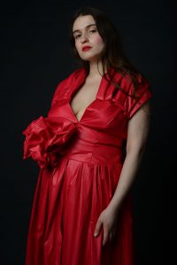 Der rote Stoff hat einen wunderbaren Glanz und kann von seiner Beschaffenheit einzigartig drapiert werden.
