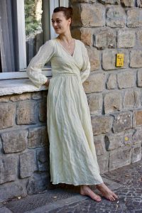 Das Kleid hat einen überschrittenen V-Ausschnitt, lange Ärmel und fällt ganz leicht bis zum Boden.