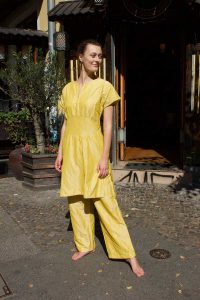 Der Stoff besticht mit seinem brillanten Glanz und verleiht dem Ganzen einen edlen Touch. Dieser safrangelbe Kaftan besteht aus einem Oberteil und einer Hose. Das Oberteil kann auch alleine getragen werden. Die Biesen im Vorder- und Rückenteil machen diesen Kaftan einzigartig.