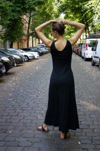 Das schwarze elegante Kleid besticht in seiner Schlichtheit, die lange entspannte Silhouette sowie die leichte Falten-Drapierung am Oberteil und am Rock. Der Rock hat einen langen Schlitz.